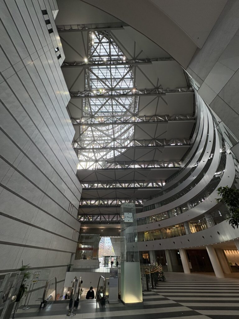 巨大なヴォイド空間に浮かぶツリー装飾が、都市に祝祭の雰囲気を添えていた。