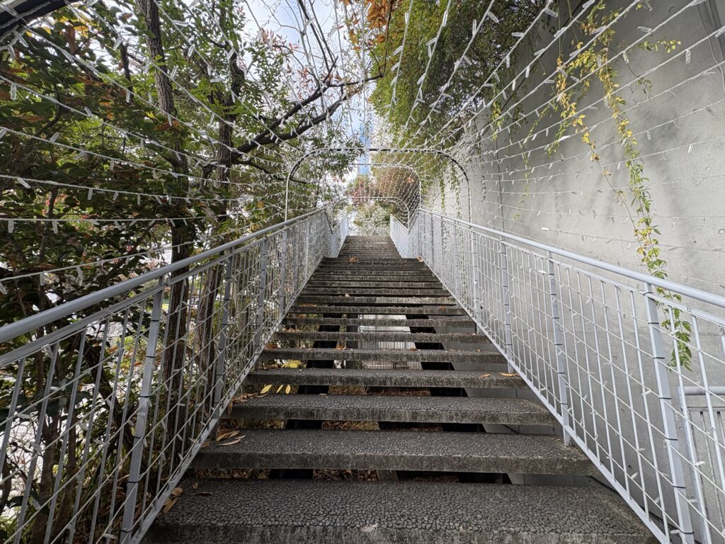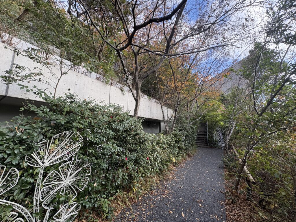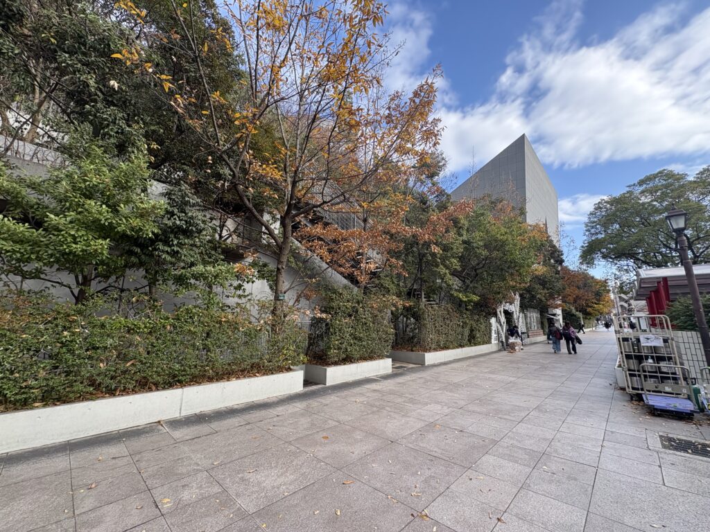 記憶の中では、公園の芝と建物の屋上緑化がなだらかにつながり、丘のような風景を描いていたが、今回は12月。木々は落葉し、建物の存在に一瞬気づかないほどだった。