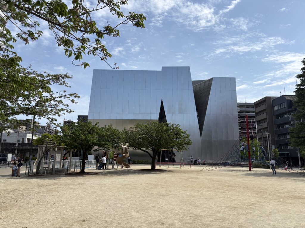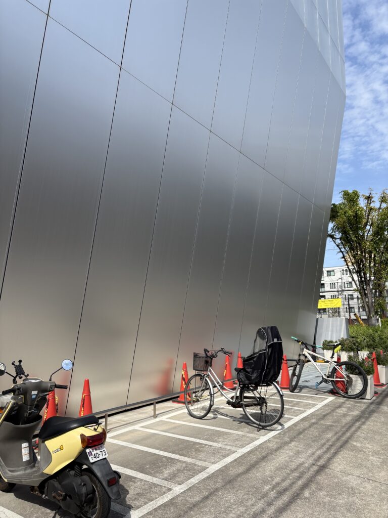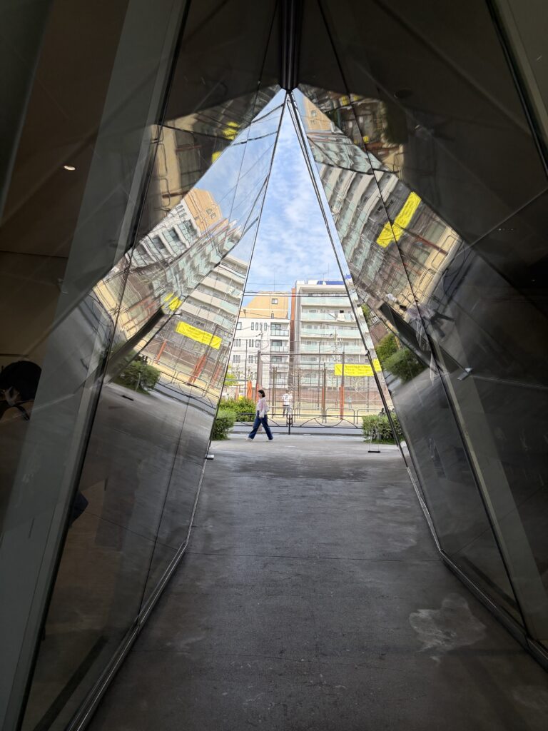 外壁の鏡面アルミパネルは、雑誌などでもよく目にするが、体感してみると確かに周辺への圧迫感をやわらげているように感じられた。公園も明るく感じられる。