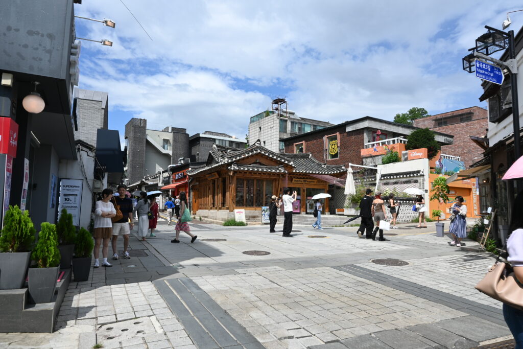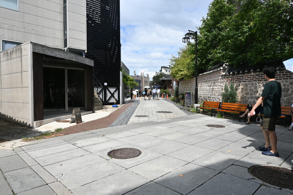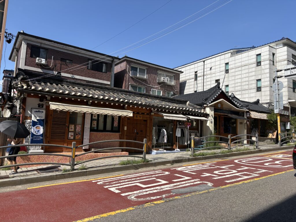 瓦屋根の伝統家屋(韓屋/ハノク)が連なる一角に、ガラス張りのカフェや、ミニマルな内装のショップが並んでいる。